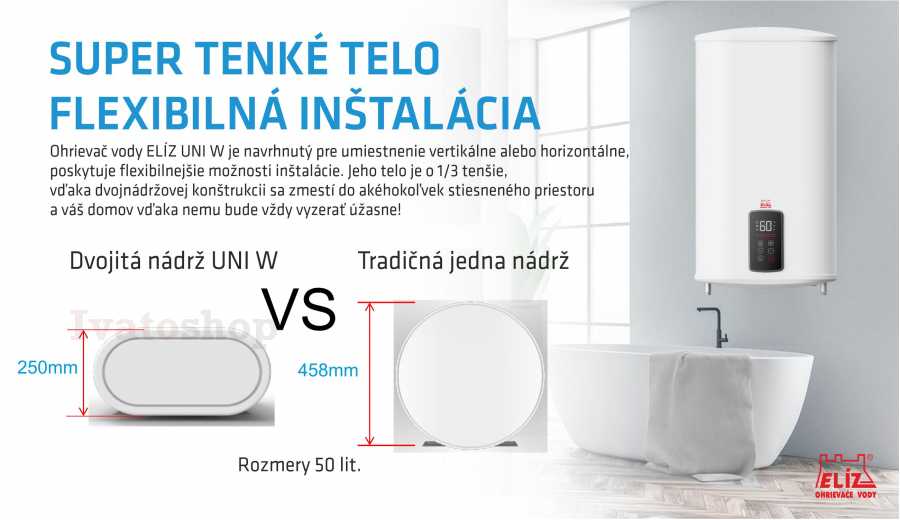 Elektrický tlakový ohrievač vody ELÍZ UNI 30 W je vyhotovený v plochom prevedení s konceptom dvoch nádrži. Každá nádrž je vybavená samostatným ohrievacím telesom. Je určený pre zvislú alebo vodovorovnú montáž a je vhodný pre jedno alebo viac odberných miest. Hĺbka ohrievača je len 245 mm.