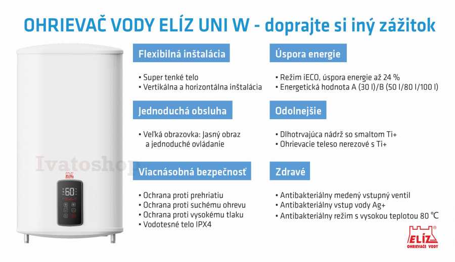 Elektrický tlakový ohrievač vody ELÍZ UNI 80 W je vyhotovený v plochom prevedení s konceptom dvoch nádrži. Každá nádrž je vybavená samostatným ohrievacím telesom. Je určený pre zvislú alebo vodovorovnú montáž a je vhodný pre jedno alebo viac odberných miest. Hĺbka ohrievača je len 295 mm.
