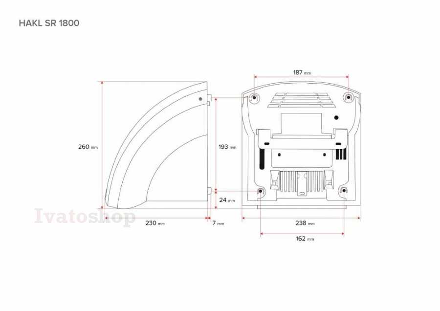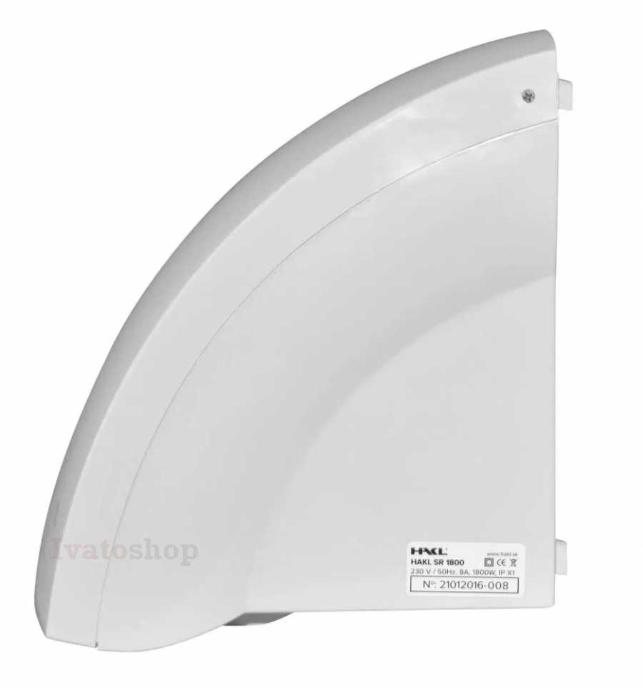 Sušič rúk HAKL SR 1800 sa automaticky uvedie do činnosti priblížením rúk ku spodnej časti sušiča. Senzor zapne špirálu a ventilátor spustí prúd teplého vzduchu. Po vzdialení rúk sa ohrev s malým oneskorením vypne. Bezdotyková prevádzka umožní hygienické a jednoduché osušenie rúk. V prípade neúmyselného umiestnenia predmetu v dosahu senzora vypne časová poistka ventilátor po jednej minúte. Sušič rúk je určený pre montáž na zvislú stenu a pomocou západky mechanizmu na zadnej strane krytu je chránený proti nepovolenej demontáži.