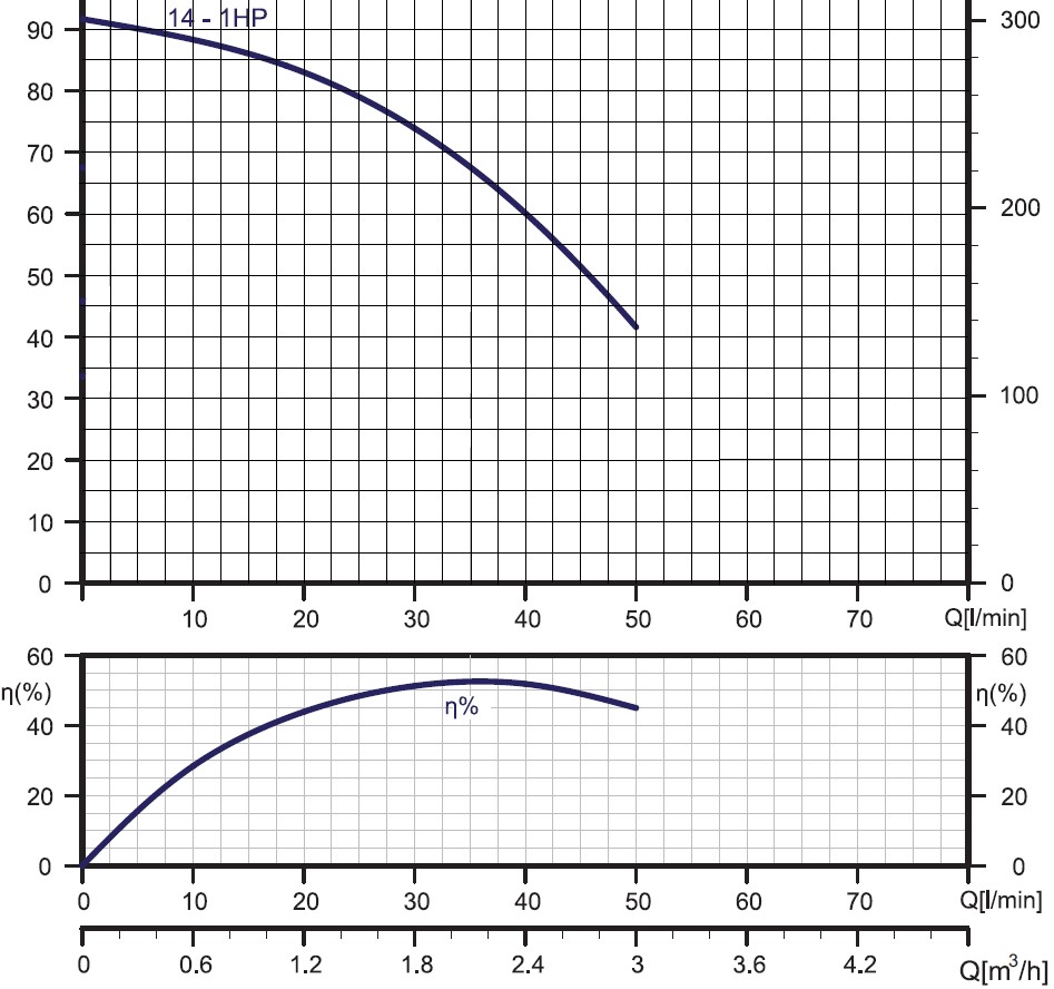 Pracovná oblasť čerpadla: Q(l/min) = 0-50, H(m) = 92-42