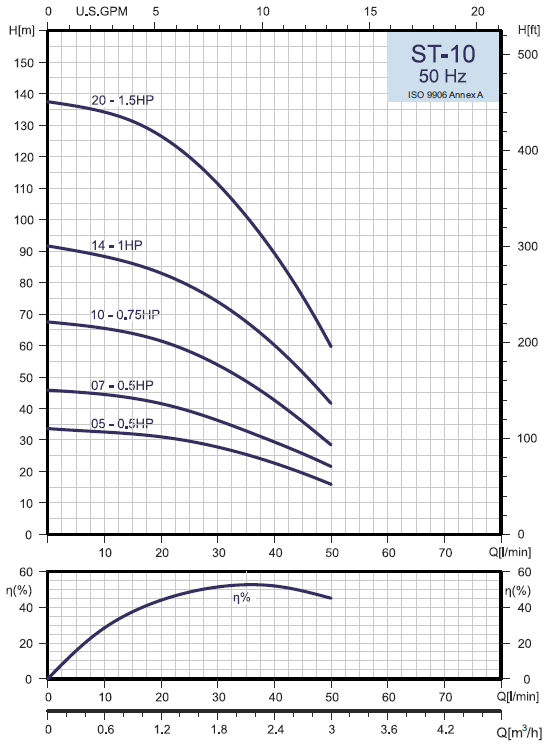 Pracovná oblasť čerpadla: Q(l/min) = 0-50, H(m) = 139-60