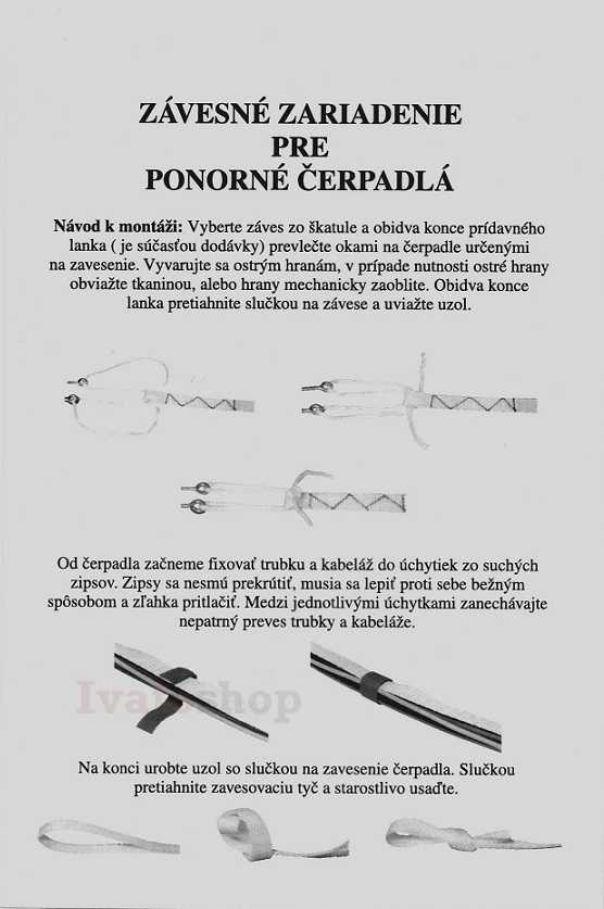Závesné zariadenie je zložené zo závesného popruhu, na ktorého konci je ušité oko slúžiace na pretiahnutie nylonového lana, ktorým sa čerpadlo fixuje. Na závesnom popruhu sú v odstupoch po 1,5 m našité suché zipsy slúžiace na fixáciu rúrky a el. kábla vedúcich k čerpadlu. Všetky komponenty tohto výrobku sú zdravotne neškodné a vhodné na styk s pitnou vodou. Záves je jednoduchý a zrozumiteľný pre bežného spotrebiteľa a svojím vyhotovením núti dodržať zásady odbornej montáže. Garantovaná nosnosť so všetkými dodanými komponentmi je max. 200 kg, no so štvornásobným istením. Všetok materiál použitý na výrobu závesu je vo vode nerozpustný, stály v ropných látkach, v riedených kyselinách, v olejoch a etanole. Certifikované pre pitnú vodu.